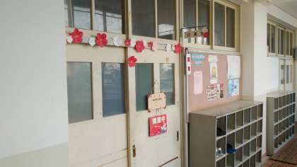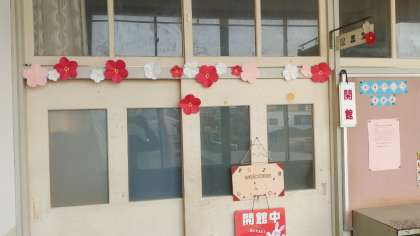 図書室の出入り口付近の装飾が、新しくなり、3月という季節らしく、かわいらしい「梅の花」が満開となりました。