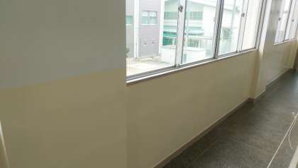 先週、卒業式を終え、これまで3年生が生活をしていたフロアーの窓側かべを、管理作業員さん方で、塗り直しをしていただきました。とても明るくなりました。