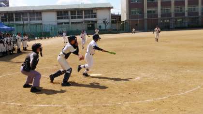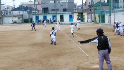 本校もチャンスがあるものの、最後の1本がでません。終盤をむかえ、お互いに1点を取り合い、タイブレイク式の延長戦に突入。本校のファースト君が難しい球をスクイズして1点をとり、この1点を守りきり、見事勝利しました。