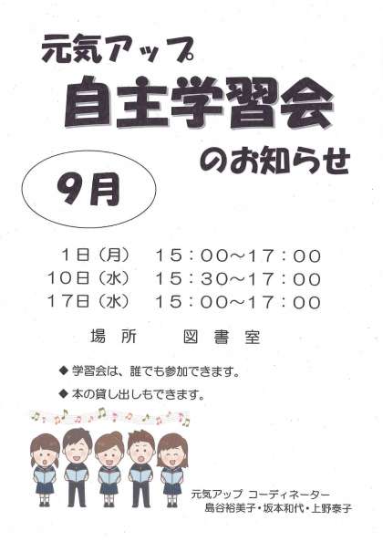9月の元気アップ自主学習会の活動予定のお知らせです。