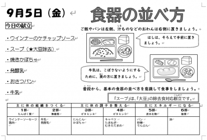 「おさつパン」、「ウィンナーのケチャップソース」、鶏肉・キャベツ・たまねぎ・にんじん・むき枝豆がたっぷりの「スープ」、「焼きかぼちゃ」、「発酵乳」などをおいしくいただきました。