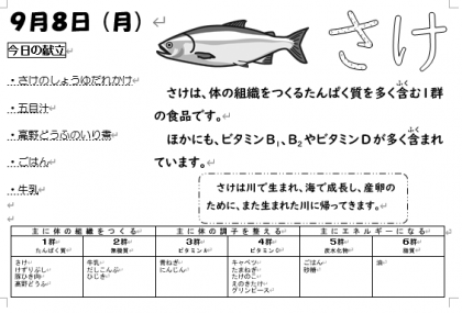 「ごはん」、「さけのしょうゆだれかけ」、キャベツ・玉ねぎ・たけのこ・青ねぎ。えのきたけなどを煮た「五目汁」、豚ひき肉・にんじん・グリンピース・ひじきなどを煮た「高野どうふのいり煮」などをおいしくいただきました。