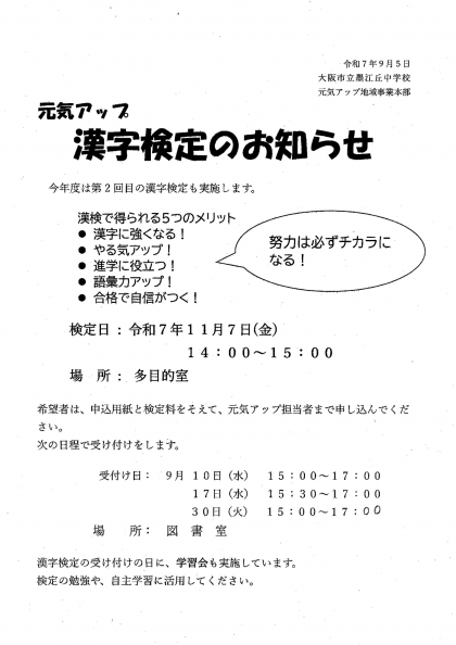 元気アップ学習会より、漢字検定実施のお知らせです。