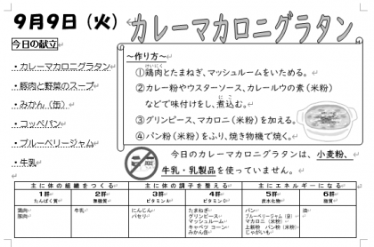 「コッペパン・ブルーベリージャム」、ボリューム感満点の「カレーマカロニグラタン」、じゃがいも・にんじん・キャベツ「豚肉と野菜のスープ」、「みかん」などをおいしくいただきました。