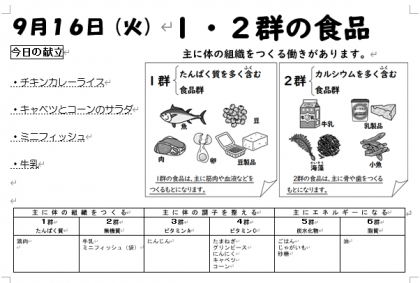 定番のじゃがいも・玉ねぎ・にんじんに鶏肉とグリンピースもたっぷりの「チキンカレーライス」、「キャベツとコーンのサラダ」、「ミニフィッシュ」などをおいしくいただきました。