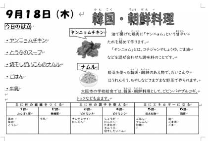 「ごはん」、みりん・こいくちしょうゆ・ケチャップ・コチジャンなどを煮たて、鶏肉にからませた「ヤンニョムチキン」、豚肉・とうふ・玉ねぎ・チンゲンサイ・にんじんなどを煮た「とうふのスープ」、「切り干し大根のナムル」などをおいしくいただきました。
