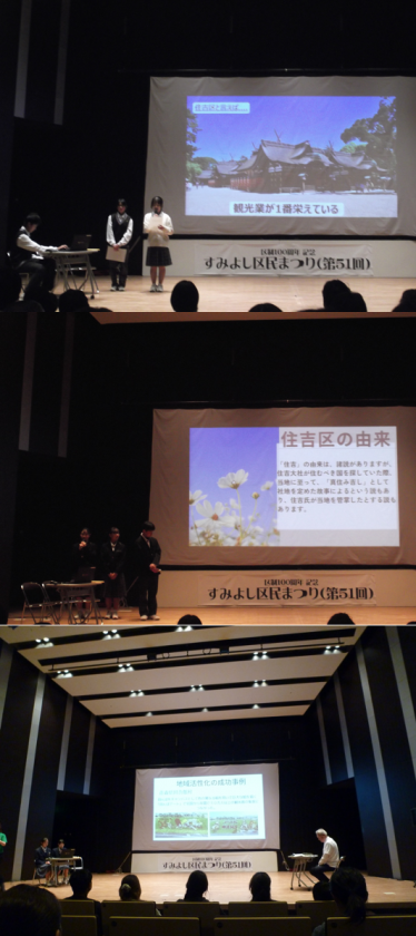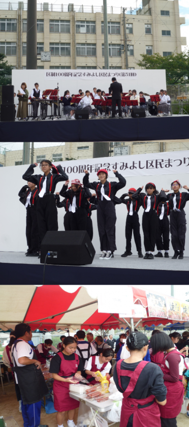 25日(土)に、《第51回すみよし区民まつり》が開催されました。本校から吹奏楽部、ダンス部、《住吉区の未来に向けた提案》についての発表(各学年代表者メンバー)が出演しました。また朝早くから会場の屋台での調理補助などのボランティアに参加してくれた人たちもたくさんいました。