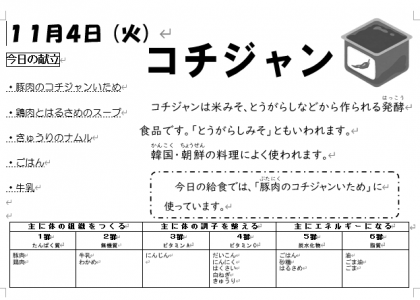 「ごはん」、大根やにんにくを加えていためた「豚肉のコチジャンいため」、白菜・白ねぎ・にんじん・わかめなどがたっぷりの「鶏肉とはるさめのスープ」、「きゅうりのナムル」などをおいしくいただきました。