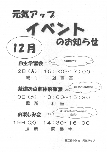 今年の元気アップ自主学習会は本日で最後となりますが、今月は『茶道お点前体験教室』と『お楽しみ会』の2つのイベントがあります。