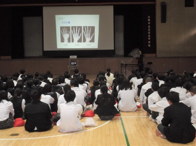 本日4限目に、1年生を対象に食育講話がありました。住吉区保健福祉センターより、栄養士の深本先生にお越しいただきました。
