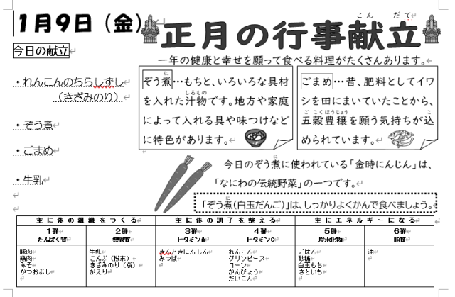 今年最初の給食は、一年の健康と幸せを願って食べる『正月の行事献立』で幕を開けました。今年もおいしい給食の時間を楽しみにしていますので、よろしくお願い申しあげます。