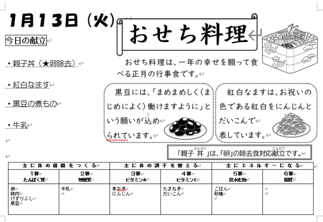 「親子丼」、大根・にんじん・米酢などを合わせて煮た「紅白なます」、「黒豆の煮もの」などをおいしくいただきました。