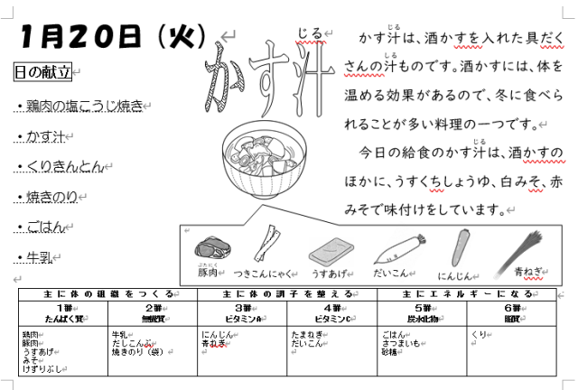 「ごはん」、塩こうじで下味をつけた鶏肉に玉ねぎを混ぜ合わせて焼いた「鶏肉の塩こうじ焼き」、上記で説明の「かす汁」、さつまいもと栗を煮て、みりん・砂糖・塩で味付けした「くりきんとん」、「焼きのり」などをおいしくいただきました。