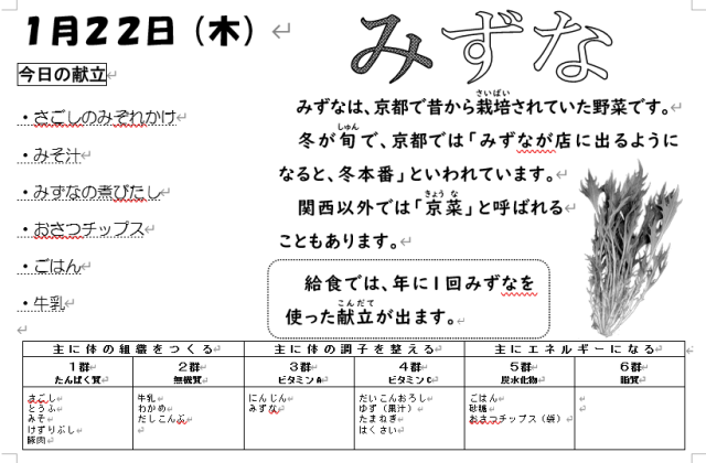 「ごはん」、焼いたさごしに煮立てた大根おろしやみりんなどをかけた「さごしのみぞれかけ」、とうふ・玉ねぎ・にんじん・白菜・わかめなどがたっぷりの「みそ汁」、豚肉とみずなを煮た「みずなの煮びたし」、「おさつチップス」などをおいしくいただきました。
