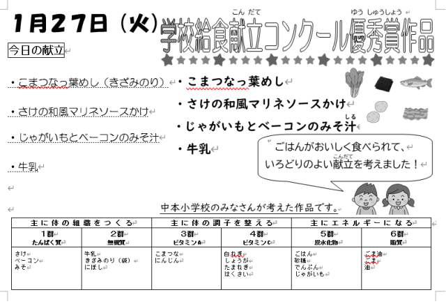 「ごはん」、ごま油にいりごまを加えていためた小松菜の「こまつなっ葉めし・きざみのり」、でん粉をまぶしたさけをなたね油であげた「さけの和風マリネソースかけ」、ベーコン・玉ねぎ・にんじん・白菜・じゃがいもを煮た「じゃがいもとベーコンのみそ汁」などをおいしくいただきました。