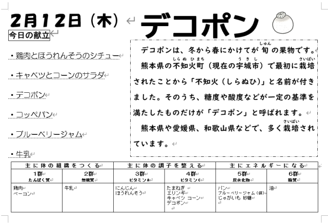 「キャベツとコーンのサラダ」、「デコポン」などをおいしくいただきました。