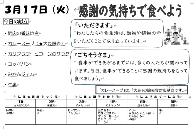 なお明日18日(水)は、給食を作っていただいてる小学校が卒業式で、4限終了後、終学活・清掃を行い下校となるため