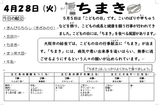 本日は【こどもの日の行事献立】で、「ごはん」、