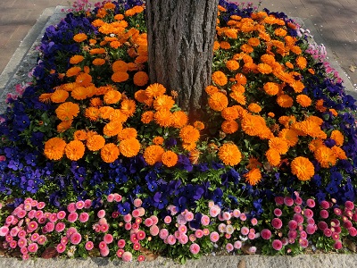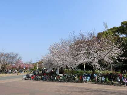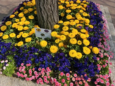桜を中心に、色とりどりの春の花が咲き乱れています。