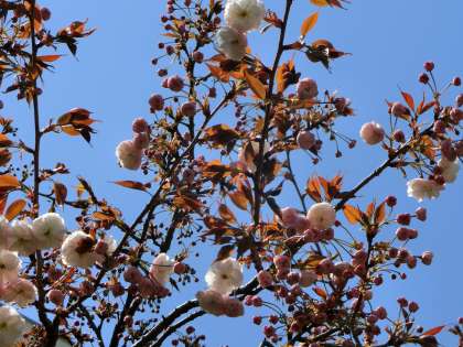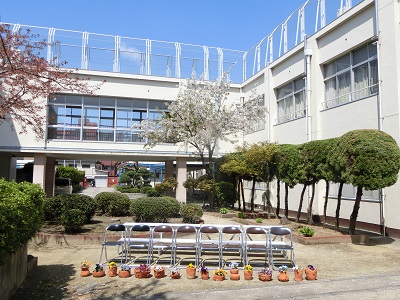 大領桜をバックに、そして足元には、手作りの鉢植えに飾られたパンジーが。