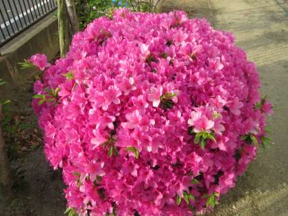 満開の花を継続しているツツジ。 朝日に花が映えています。 まるで、赤紫の毬(まり)のようです。