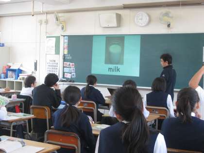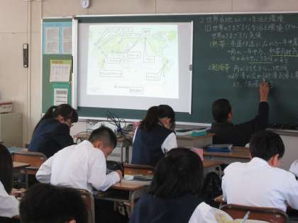 プロジェクターで写真や単語、世界地図が映し出され、わかりやすく展開されています。