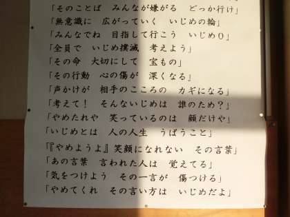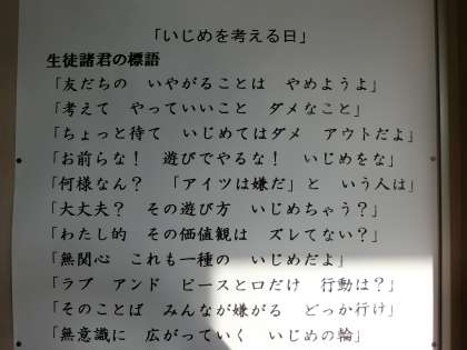 この日に向けて、生徒諸君に、いじめに関する標語を作ってもらいました。