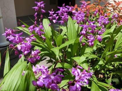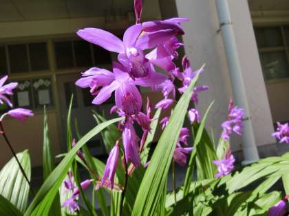 紫蘭の花が、陽があたり、少し上を向いています。