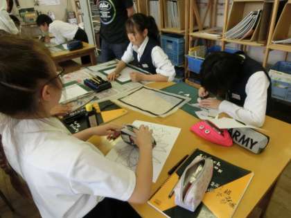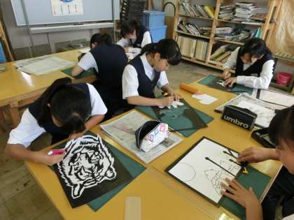 美術の時間、生徒たちは「切り絵の世界」に挑戦しています。