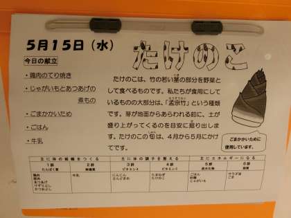 本日のメニューは、「ごまかかいため」!? タケノコと鰹節の炒めもの。ご飯にかけて、いただきます。
