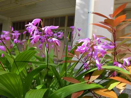 朝日を浴びた紫蘭。 紫が、とても美しく輝いています。 華やかな中庭です。