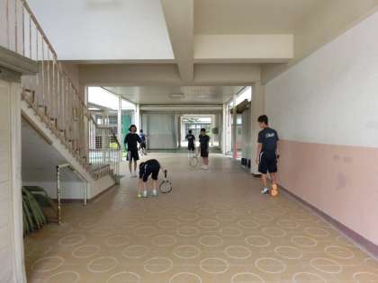 テニスコート、そして、ピロティースペースを使って練習しています。