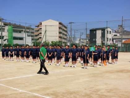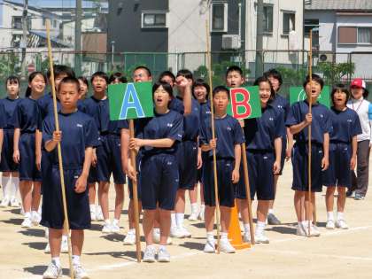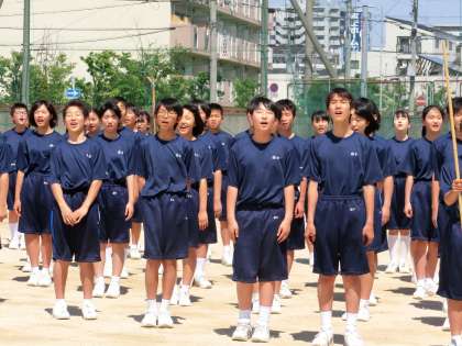 ポールに向かって注目し、大きな声で校歌を歌っています。