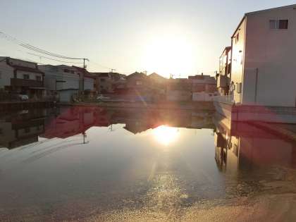 水田に映る、綺麗な「逆さ夕陽」に遭遇しました。
