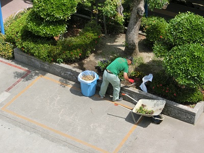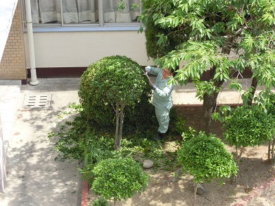 とても暑い中、管理作業員さんが樹木の剪定と草花苗の植え付けに精を出していただいています。