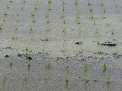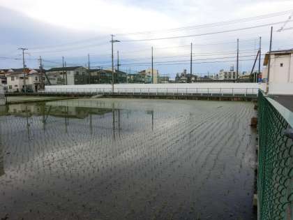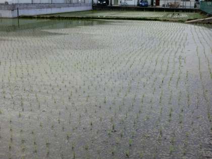 学校のお隣の田んぼに、新しい苗がお目見えしました。