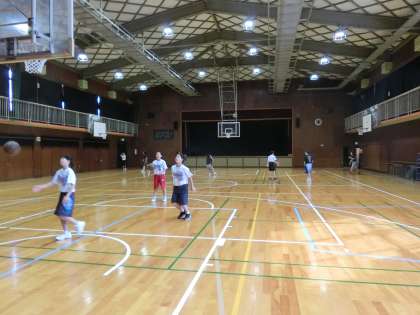 体育館で女子バスケットボール部が練習をしています。