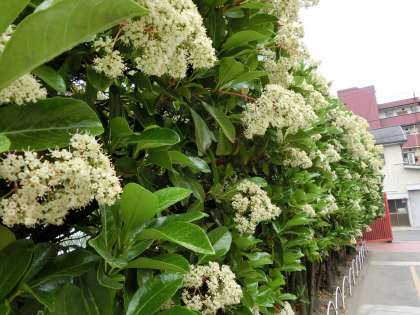 正門の珊瑚樹。 満開で、生徒たちを迎えています。 小さな花ですが、集まると見事です!