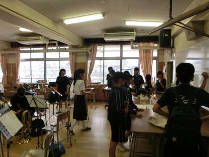 音楽室では、吹奏楽部が練習の準備を行っています。