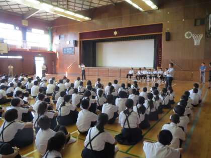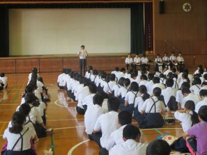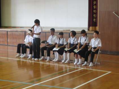 9月22日に後期生徒会役員立会演説会が開催されました。前期生徒会役員の皆さんは、毎朝、校門に立ってのあいさつや全校集会の運営などさまざまな活動によく頑張ってくれました。前期に引き続いて立候補してくれた生徒の皆さんに、新たに立候補してくれた皆さんが加わって5名の生徒が立候補してくれました。立候補者はそれぞれに立派に演説をしてくれました。そして全員が信任されました。後期の役員の皆さんも大領中学校がより良い学校となるよう頑張ってくれることを期待しています。