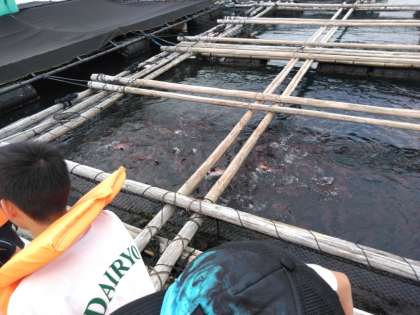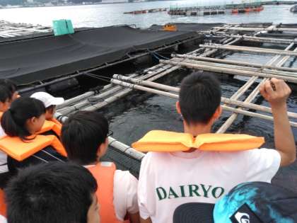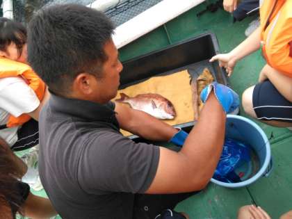 エサやり体験、そして、鯛をしめます。みんな興奮しています!