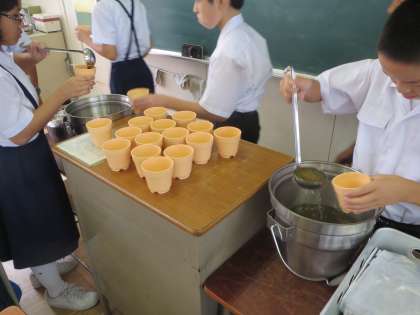 1年生の給食の様子です。「スープの味はどうですか」という問いかけに、「まずまず」とか「きびしい」とかいう感想でした。「美味しい」という感想はありませんでした。