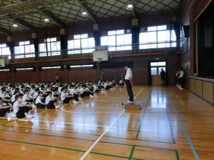 前回の集会では、「授業中の姿勢」についてお話しました。頑張っていますか。学校の基本中の基本です。楽する気持ちに負けず、努力しましょう。