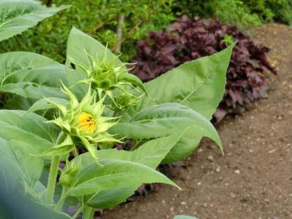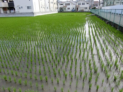 夏に向けて、水田の苗が成長し、ひまわりも背が高くなって、花をつけています。