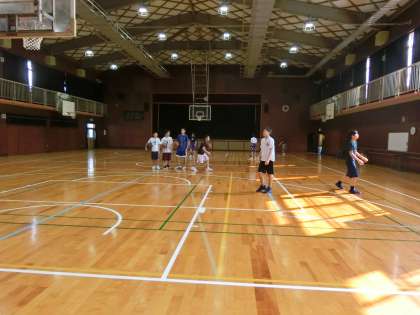 今朝は、2・3年のバスケットボール部員が練習を行っています。