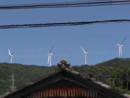 まわりには、みかん畑、水田、山には風力発電の大きな羽根が見られます。