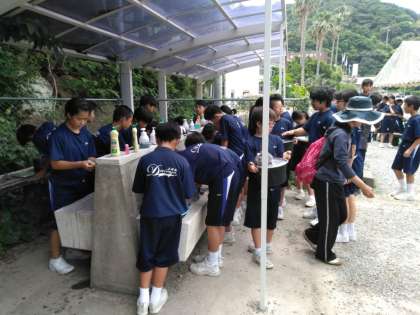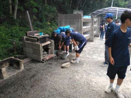 かまどの後始末、鍋やお皿洗いなど、役割分担して片付けています。
