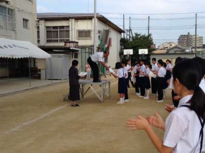 9月29日(月)生徒会役員および各学級代表等の認証式が行われました。生徒会役員の皆さんは22日の立ち合い演説会でそれぞれしっかりと演説をして信任されました。前期から引き継いだ役員および各学級の代表・委員のみなさんは、自分の責任を立派に果たせるように頑張ってもらいたいと思います。校長先生からは、生徒も教職員もお互いに努力して美しい学習環境を築いてもらいたいという言葉がありました。