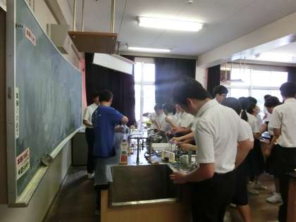 エアコンのない理科室ですが、生徒たちは汗をかきながら頑張っています。