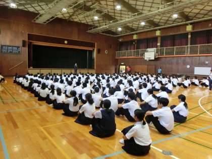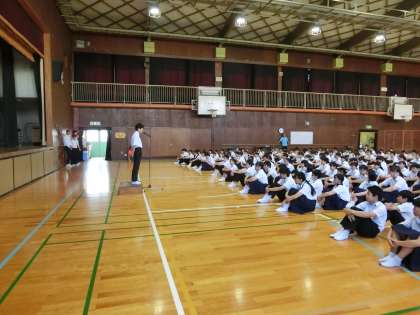 校長講話の後、女子バスケットボール部の表彰、委員会からの報告がありました。